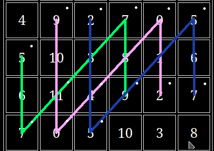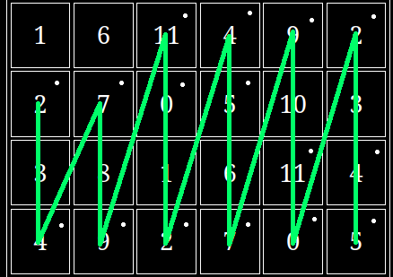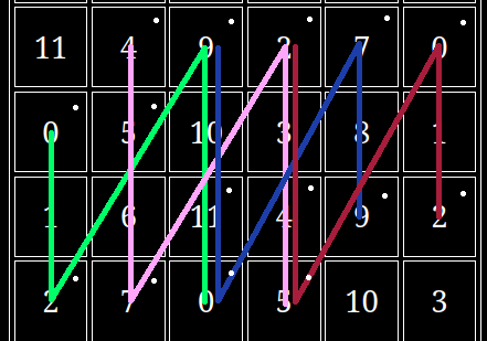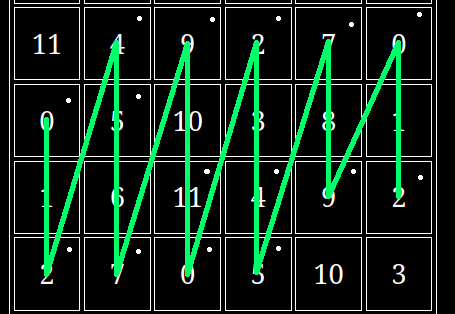 This diagram looks complicated than it is. We start with green, performing 0 2 9 11 0, then to pink: 4 5 7 2 4 5, red: 2 4 5 0 2, and then we do the whole thing backwards so red: 2 0 5 4 2, then blue: 9 7 0 11 9 and so on until we reach our starting position, at this point we've completed one iteration.