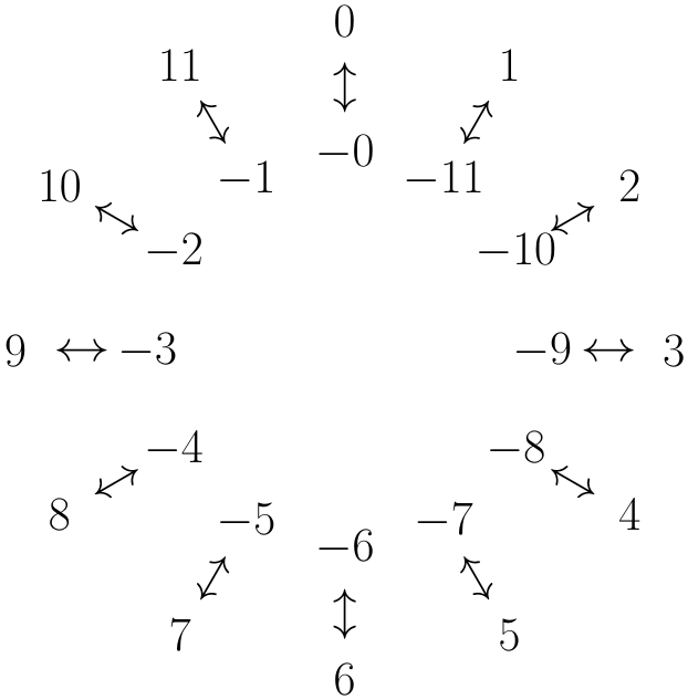 This means that given any number from 0 to 11, there is a negative number from -11 to 0 which is "equivalent" to it. Following a similar process to the one we just did with -3, we can figure out all the equivalences.