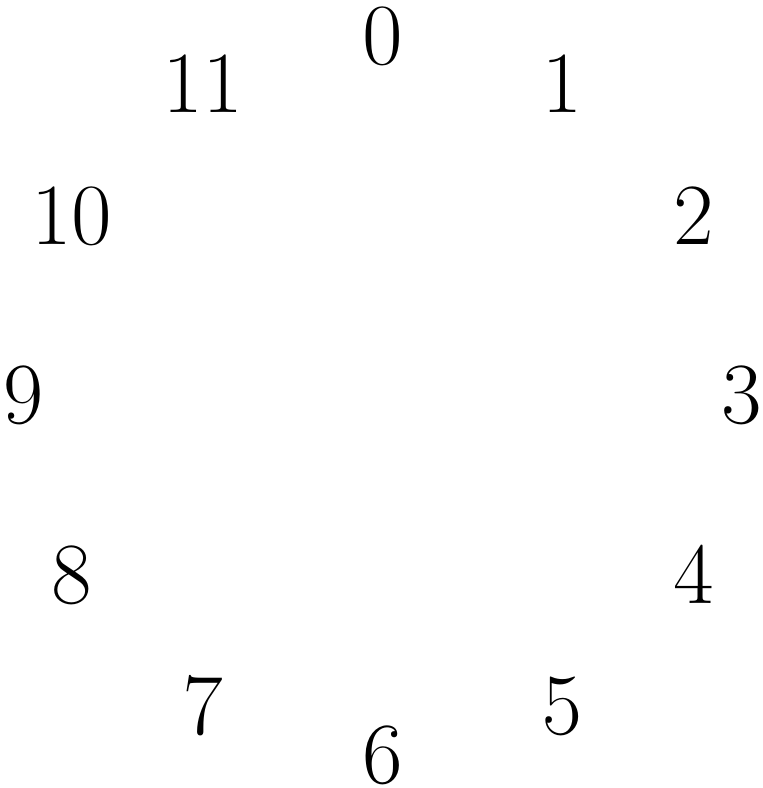The way we deal with the more complicated situtations should become clear momentarily. If we were asked to compute 10 + 5, then normally we would answer 15, but in our system we mainly use the numbers 0 to 11, so in this situation we have to "wrap around", so it would be 10, 10 + 1 = 11, 10 + 2 = 0, 10 + 3 = 1, 10 + 4 = 2, 10 + 5 = 3, so 10 + 5 = 3 in our system.